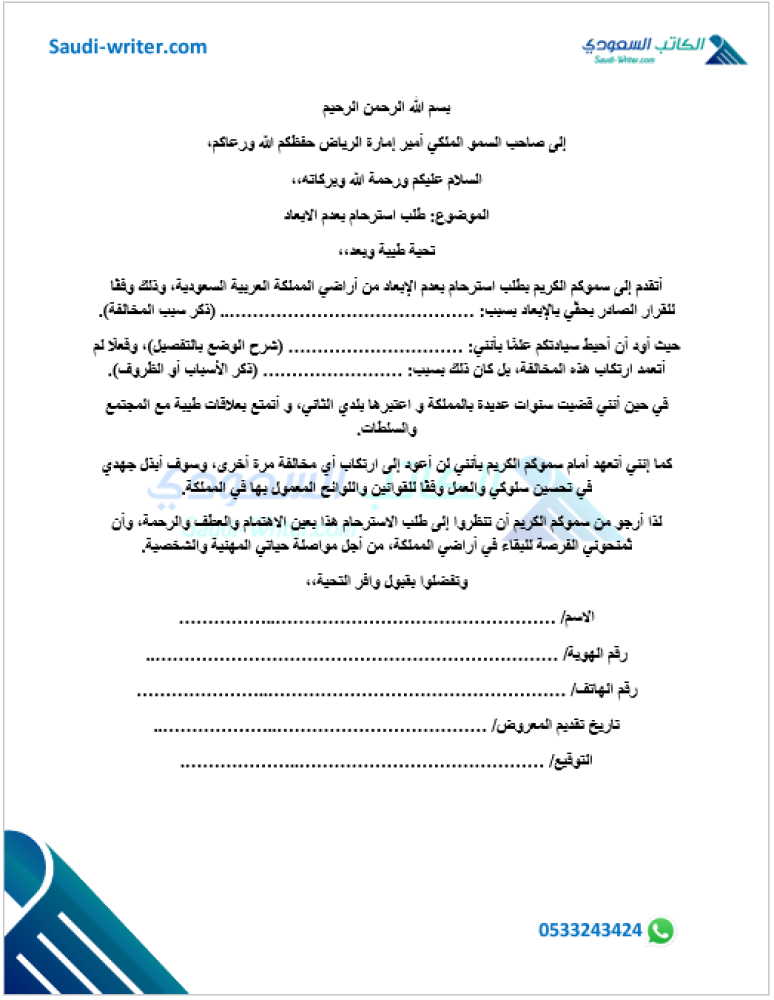 أتقدم إلى سموكم الكريم بطلب استرحام بعدم الإبعاد من أراضي المملكة العربية السعودية، وذلك وفقًا للقرار الصادر بحقّي بالإبعاد بسبب: ………………………………………………………………………………….. (ذكر سبب المخالفة).