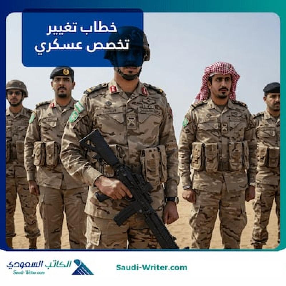 أتقدم إلى سعادتكم بهذا الخطاب وكل رجاء من الله سبحانه وتعالى ثم من سيادتكم النظر في طلبي بغرض تغيير تخصصي العسكري من/ ……………، إلى/ ………………، أنا الجندي/ …………….…، بوحدة/ …………….…………………، حيث أنني التحقت بالخدمة العسكرية منذ/ …………… سنوات، وخلال هذه الفترة أُتيحت ليَّ الفرصة لاكتساب العديد من المهارات، كما أنني عملت على وتطوير خبراتي في مجال عملي وتخصصي.