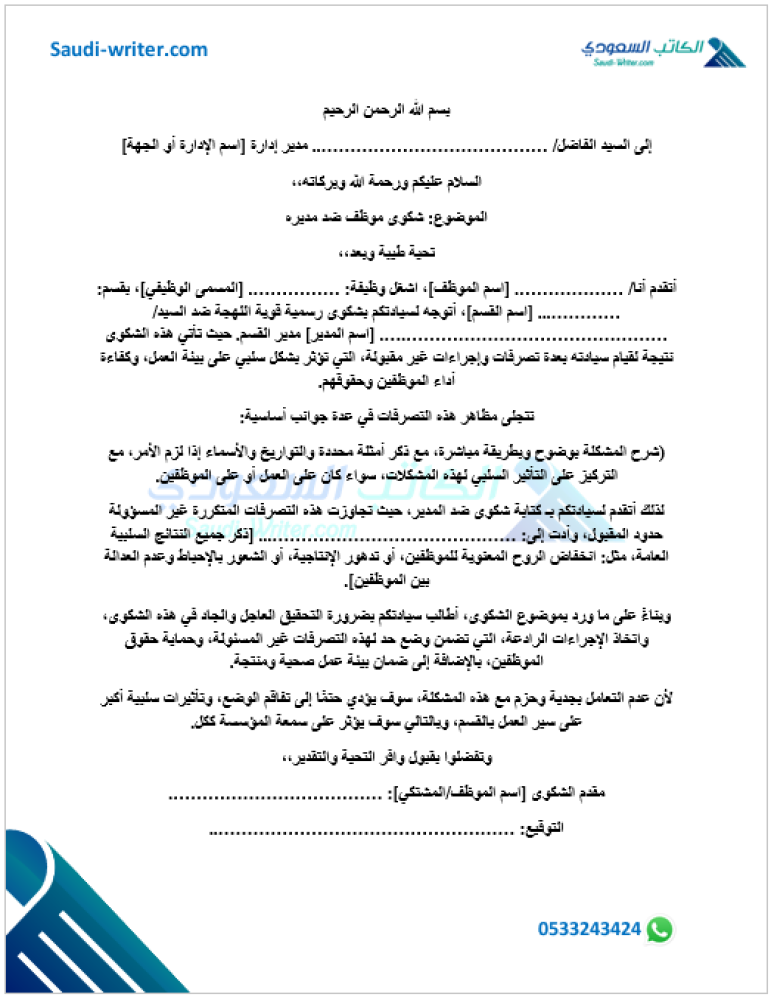 يمكن كتابة شكوى ضد المدير المتسلط والاستعانة بالنموذج التالي: